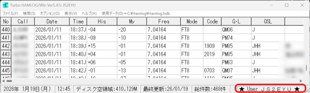 Turbo HAMLOGを起動して右下にユーザー名(コールサイン)が表示されていれば登録は終了しています。