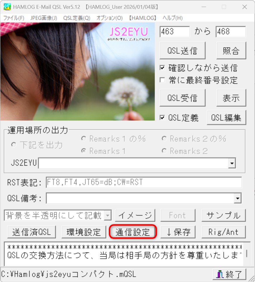 Turbo HAMLOGと連携して動作する電子QSLアプリでHAMLOG E-Mail QSLを略してhQSLと呼ばれています。交信証(QSLカード)を電子メールを通じてJPEG画像として送信するところがhQSLの特徴です。