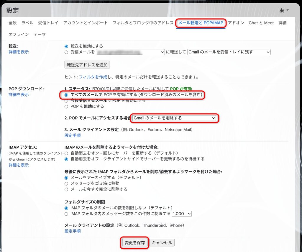 - POPでメールアクセスする場合 を [Gmailのメールを削除する] に変更