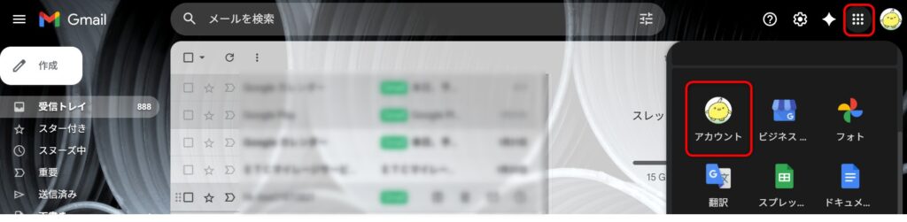 Gmailアプリからアプリ選択ボタンを押して「アカウント」をクリック(自身のアイコン)