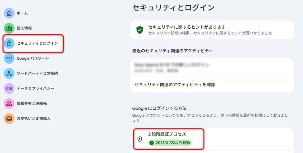 「セキュリティとログイン」で「2段階認証プロセス」を有効にする