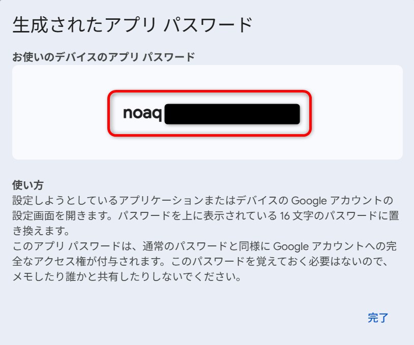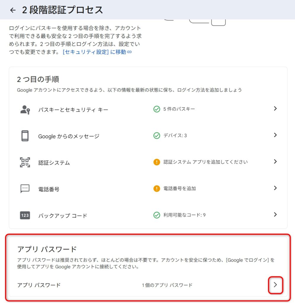 「アプリパスワード」の項目が無い場合は、Googleにログインした状態で以下のリンクからアプリパスワードページを開く