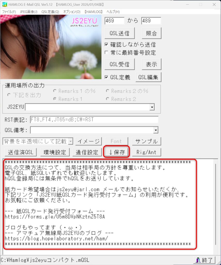 フォント(文字色、サイズ)は変更可能ですが、この位置に文字が重なる前提で画像ファイルを準備しないとデザイン的に不細工なQSLになってしまいます。